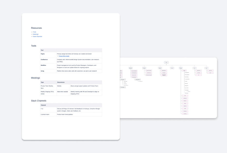 New Designers can better familiarize themselves with the Design culture at ShipHawk, and how workflows and collaboration amongst the Product Team looks like. The site map, pictured on the right, includes links to the corresponding Figma page, allowing for easier reference to previously designed mockups.