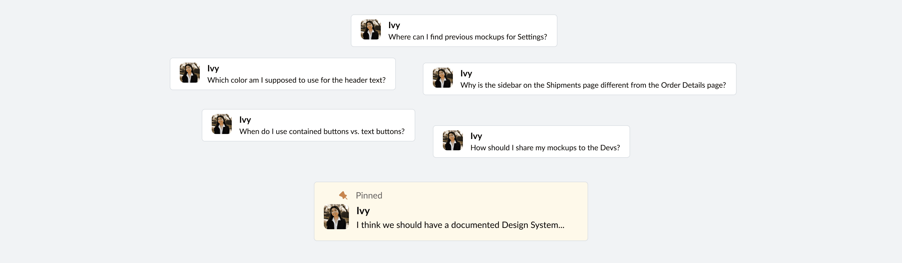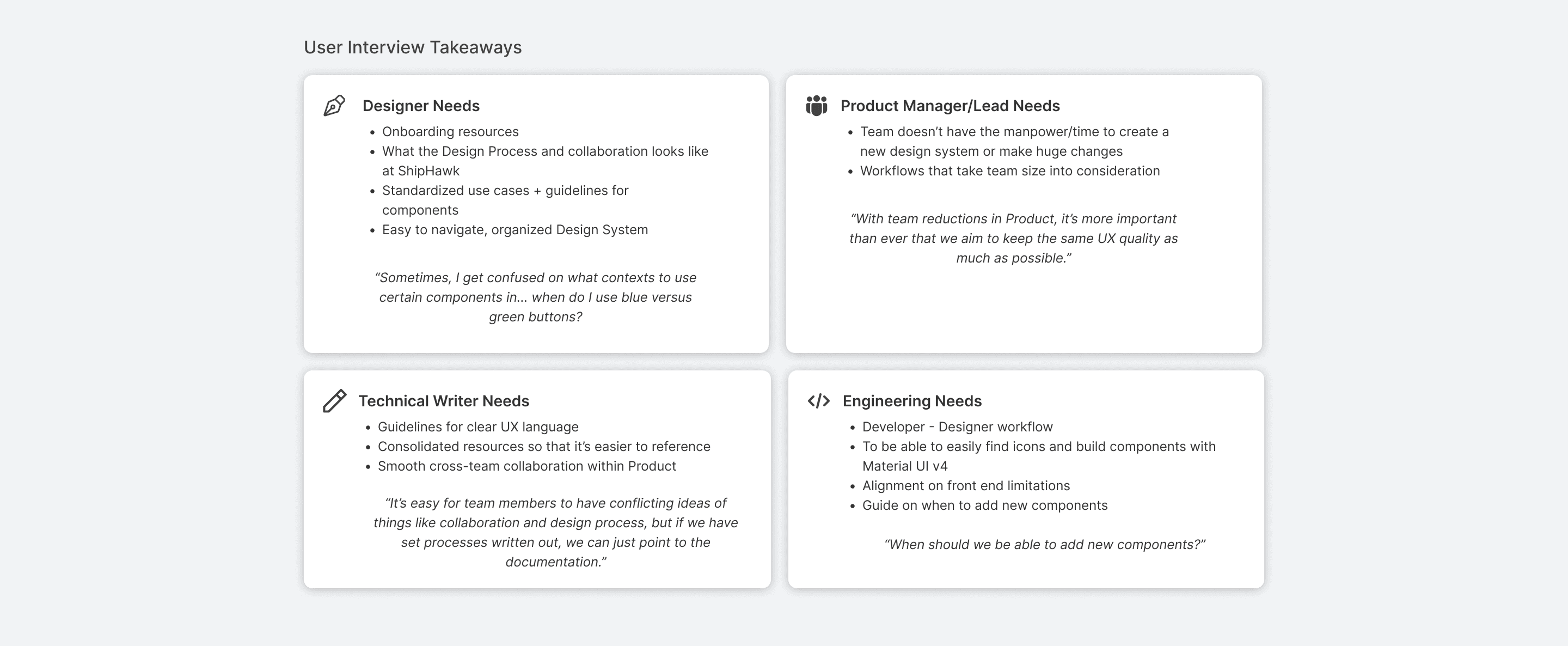 As the only ShipHawk designer at the time, I didn’t have any other designer to consult with, so I relied on my own experiences when thinking about how future SH designers could use this documentation. I thought about the gaps in knowledge I had and what resources would’ve been helpful as a new hire. Later on, I connected with Amanda Crissman, a Senior Product Designer at AppFolio that had experience building Design Systems. From Amanda, I got to hear about her first hand experiences in cross-team collaboration when crafting a Design System and Product Team workflows.
