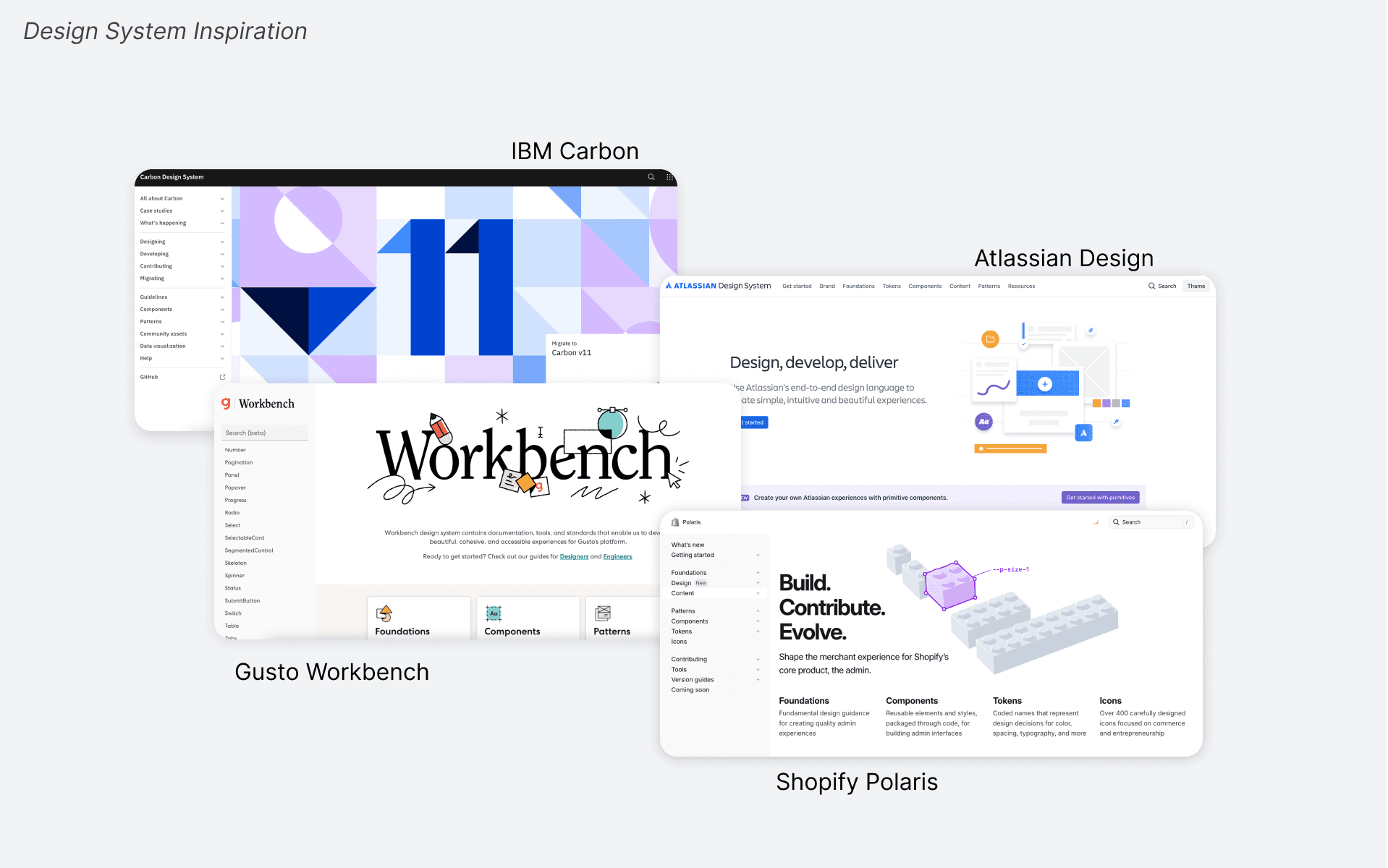 I first decided to do some research and analyze the design systems of high design maturity companies: Shopify Polaris, Workbench Gusto, Atlassian Design System, IBM Carbon. From these design systems, I got a sense of the tone and language being used, how components are properly named, and how strong design teams established guidelines. I noticed that they all followed a similar structure of Foundations, Components, Patterns, etc. and decided to adopt that as an outline for the content.