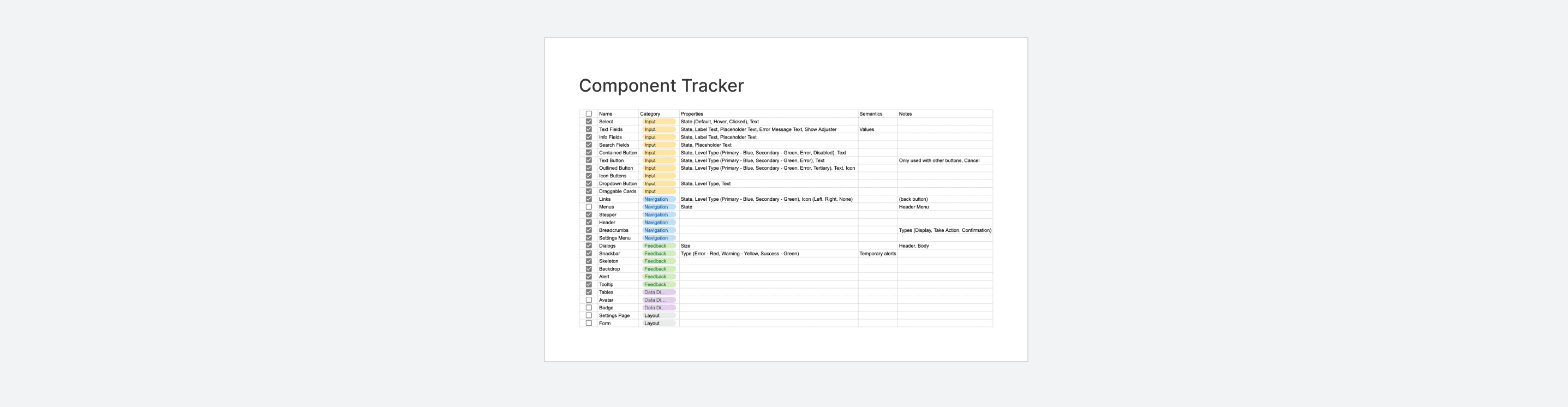 Keeping these goals in mind, I dived into auditing the site to take note of all the components. To organize everything, I created a spreadsheet to track the components and their variants. I also used this to cross reference what components had already been built in Figma and to determine what needed to be added.