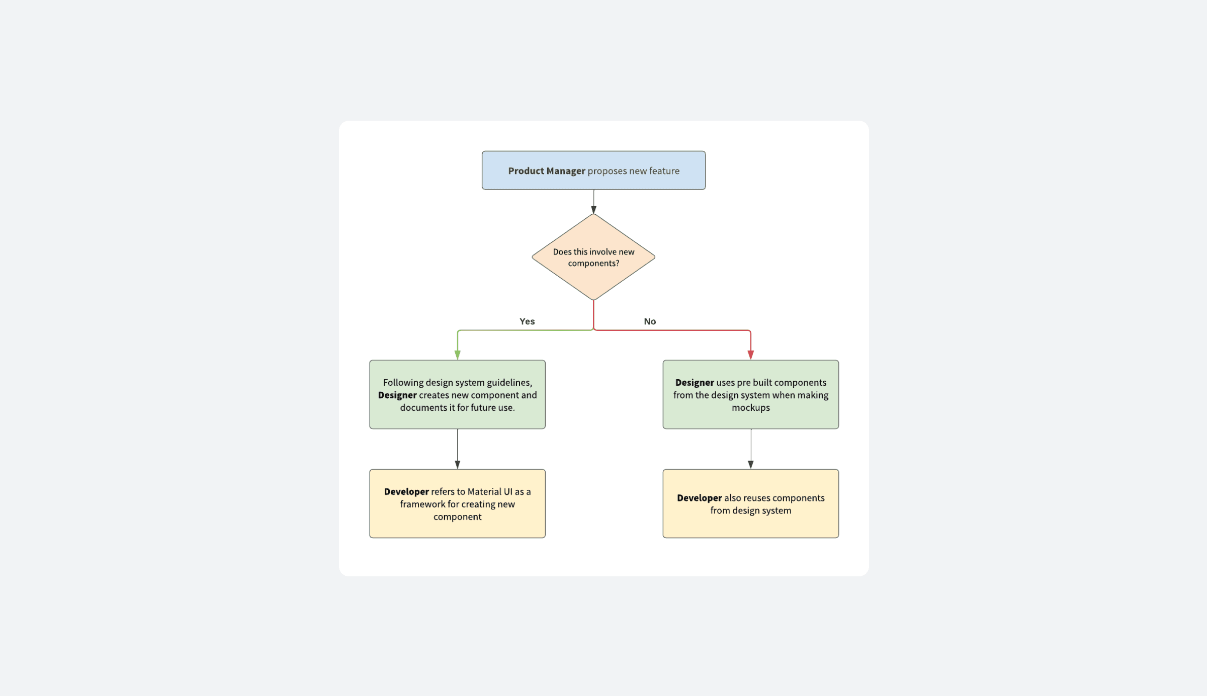 Use this decision chart as a guide when deciding when to add to the design system. The goal for this is to help Product Managers, Designers, and Developers align in maintaining the documentation, keeping consistency, and avoiding any unnecessary additions.